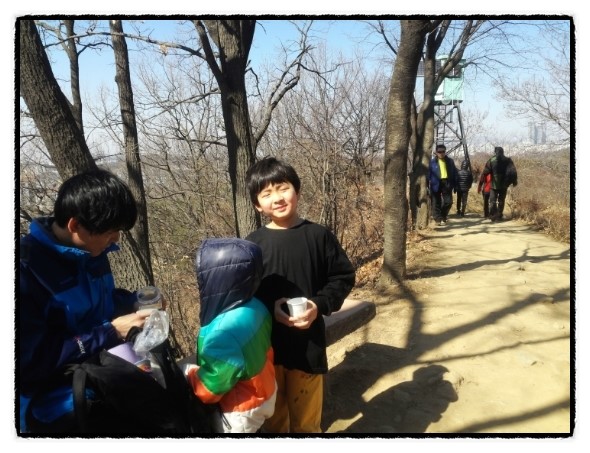 계속 산을 오르다보면 철탑이 보이는데, 마침 여기까지 오면 왠지 숨이 차다. 그래서 철탑 옆에는 벤치가 마련되 있고, 우리가족도 늘 이곳에서 물을 한모금 마시게 된다.