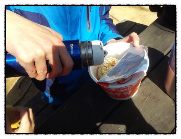 미리 준비한 뜨거운 물을 붓고, 무거운 돌같은 것을 주워다가 얹어놓고는, 평소보다 2~3분 정도 더 기다렸다가 먹으면 된다.