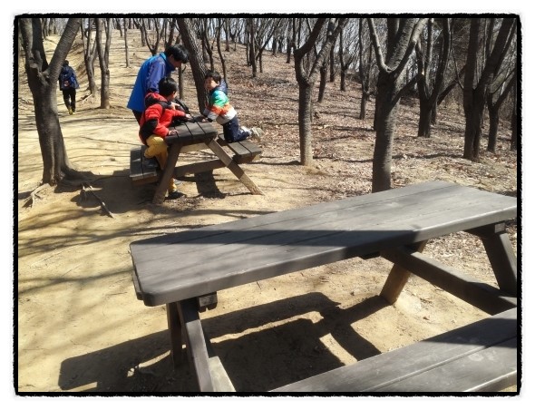 그 중에서 우리가족은 늘 이 곳을 택해 간식을 먹는다. 멀리서 이 벤치만 보여도 아이들은 "간식먹자~~~" 하며 달려갈 정도이다.
