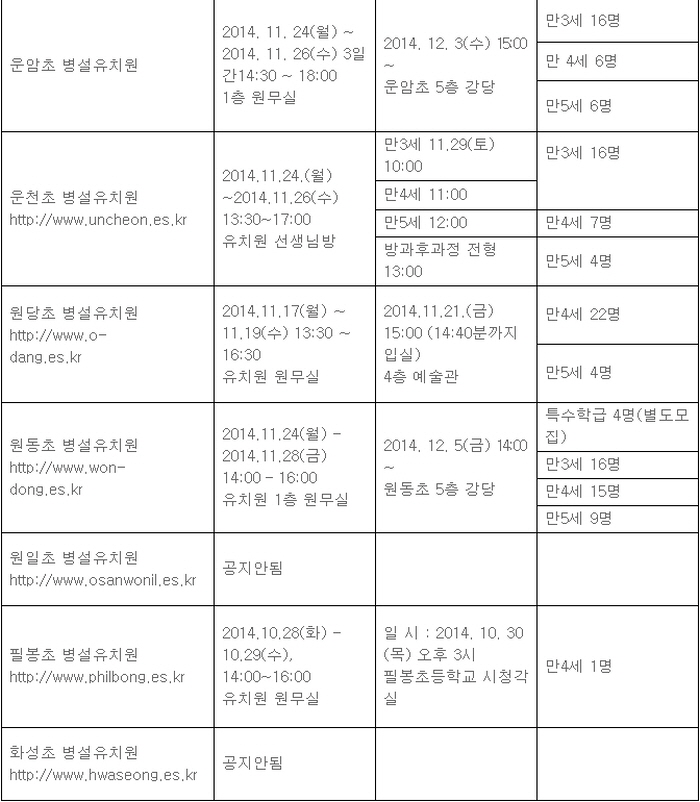 보육료 지원 중단에 대한 염려로 공립유치원이나 병설유치원에 대한 관심이 여느 때보다 더 집중되고 있는데요. 그래서 오산시내 초등학교 병설유치원의 원아모집 안내를 드리려고 해요.
