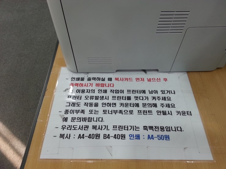 복사료는 1장당 40원이에요. 문구점보다 훨씬 저렴하죠?