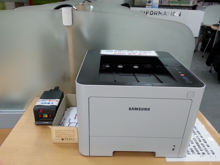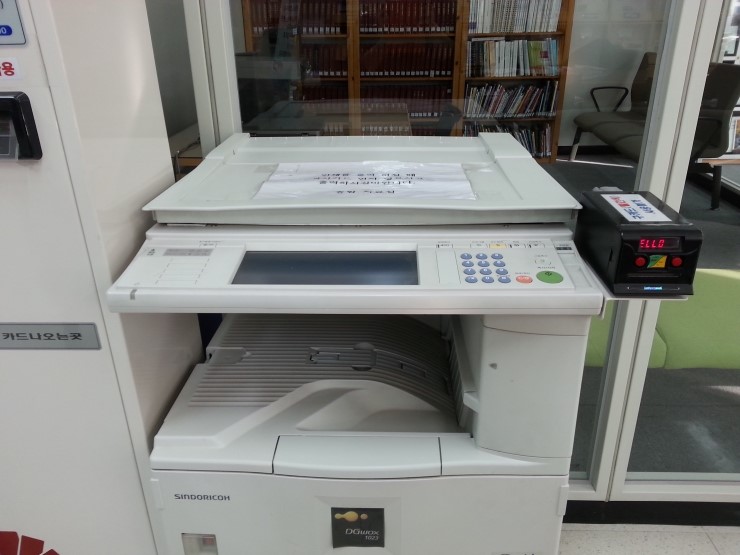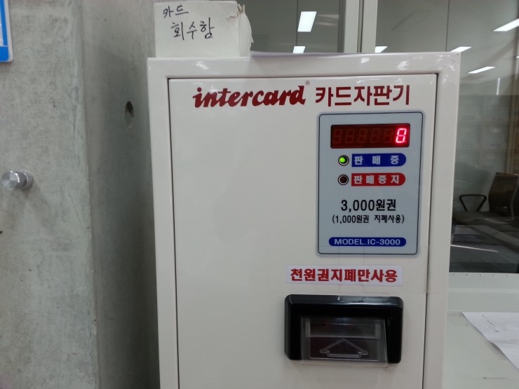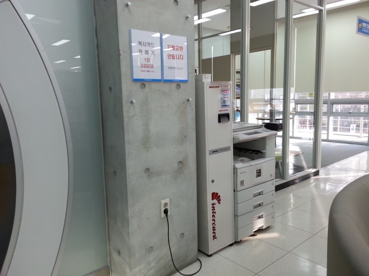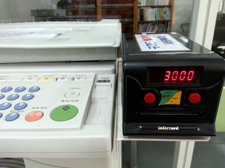 3층 종합자료실에 들어서면 바로 왼쪽에 복사기가 설치되어 있어요. 복사기 옆에 있는 복사카드(1개 3,000원)를 구입해서 복사기에 넣어 사용하면 되는데요.