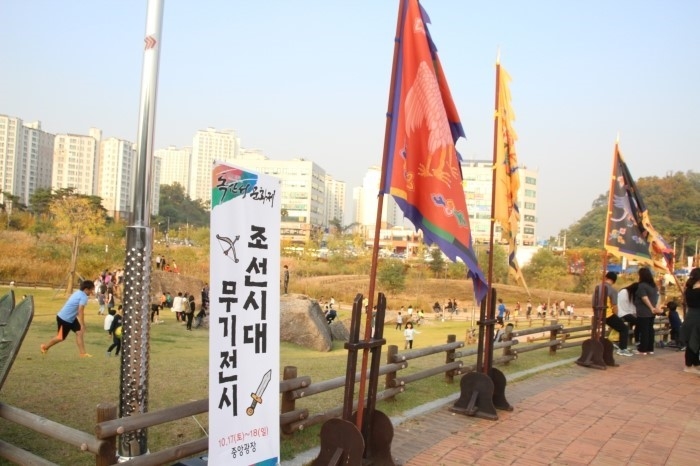 ▲ 중앙광장에 전시된 조선시대 무기와 푸른 잔디가 어색하게 조화롭습니다.