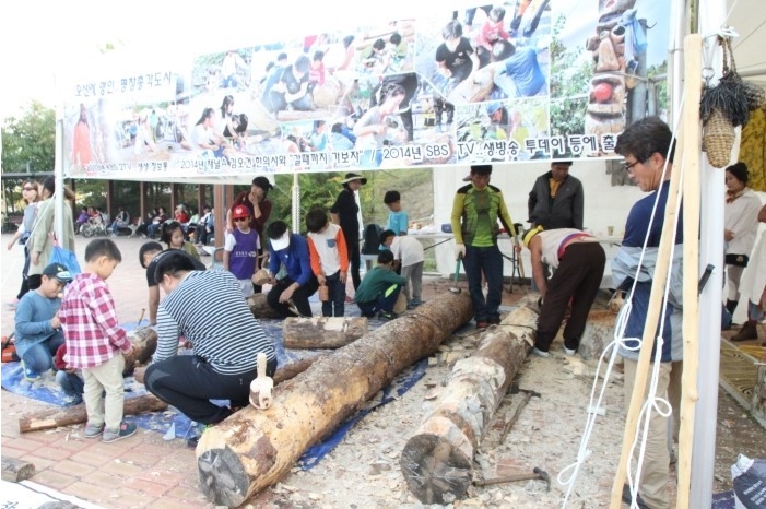 ▲ 한쪽에서는 장승만들기에 어른, 아이 모두가 한마음으로 분주합니다.
