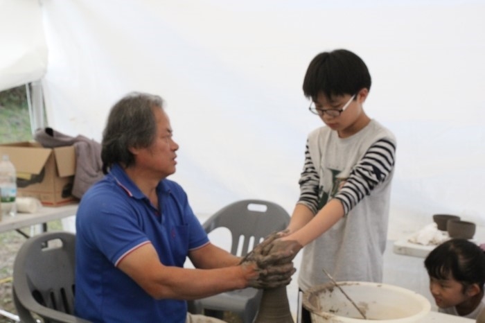 ▲ 진지한 표정으로 고사리손과 맞잡은 장인의 손에서 항아리가 태어납니다.
