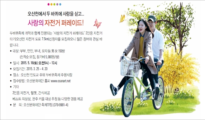 선착순 모집이며 참가비 5,000원이 있으니 잊지마시고 2인용 자전거의 낭만을 느껴보세요.