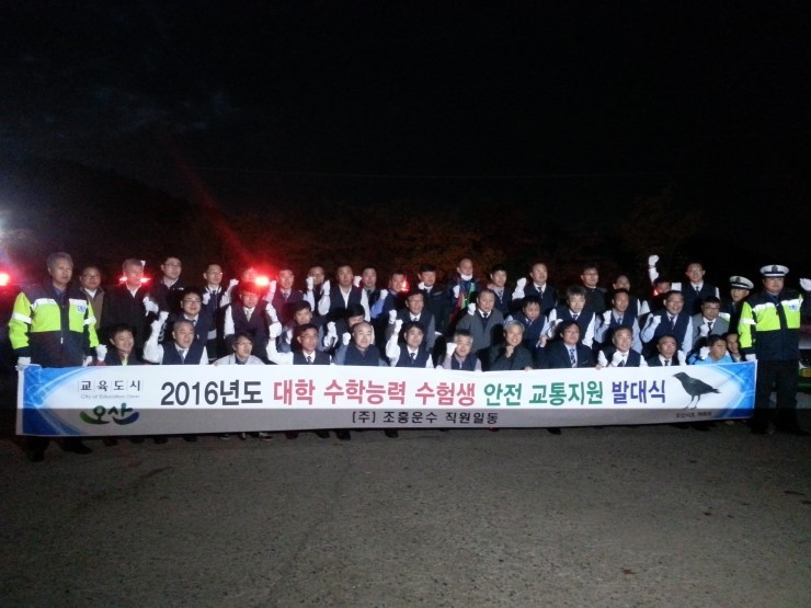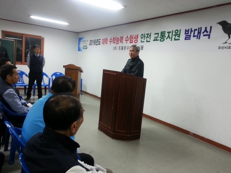 "조흥운수 직원 여러분들 오랜만에 뵙습니다. 안녕하셨지요~?^^ 택시 본연의 업무도 바쁘고 고단하신데 이렇게 수능날 수험생을 위해 봉사의 열정을 보여주셔서 정말 감사합니다. 다행히 오늘 날씨가 춥지 않아서 봉사해주시는 기사님들도 또 수험생들에게도 더 없이 좋은 날씨인거 같습니다. 해마다 무료승차로 수험생들과 그 학부모들에게 큰 도움을 주고 계서서 참 든든하고요~ 날씨가 점점 추워지는데 여러분들 건강 조심하시고 앞으로도 오산시를 위해서 친절하고 다양한 서비스로 오산시와 함께 해 주시기를 부탁드립니다."