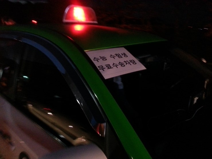 수능 수험생 무료수송 차량 이라는 라벨을 앞 유리에 크게 붙착하고 각 주요 기점으로 출동합니다. 택시별로 각각 정해진 터미널, 오산역, 버스정거장, 아파트 입구 등 에서 대기합니다.