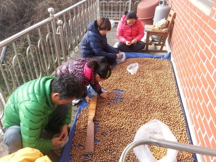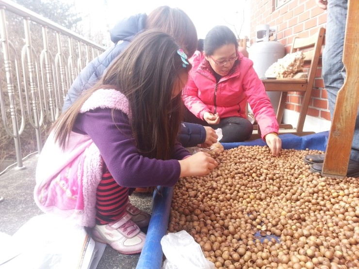 1. 산에서 주워온 도토리를 햇볕에 잘 말립니다. 2. 잘 마른 도토리는 깨끗한 운동화를 신고 살살 비비듯이 발으면 껍질이 잘 갈라집니다. 3. 또는 넓은 판자를 이용해 무게를 실어 비비듯이 누루면 이 역시 껍질이 잘 갈라집니다. 4. 갈라진 껍질을 살짝 떼어내면 톡 벗겨집니다.