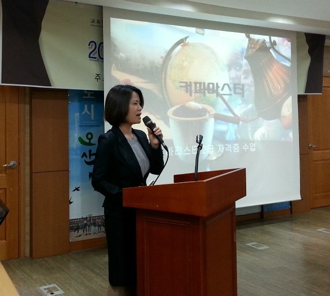텔레비전 광고 탓이겠지요? "2080"이라는 단어에 치약이 딱 떠올라요. 20개의 건강한 치아를 80세까지~~ ㅋㅋ ![]() 2015 민관학 협력 전문가 양성과정으로 20세부터 80세까지 오산시민 누구나에게 개방된 커피바리스타과정인데요. 월, 화, 수, 목요일 반이 개설되고 각 반에 10명의 소수정예 인원으로 진행된답니다. 수강생모집은 시작시간인 9시 전부터 줄을 선 열화와같은 호응으로 일찌감치 마감되었고, 대기자도 그 인원만큼 있다고 하니 그 관심과 반응을 알만하죠? ![]() 학습자들이 하나 둘 들어오시고 개강식이 시작되었습니다. ![]() 바리스타 과정 개설까지의 이야기, 앞으로의 프로그램에 대한 전반적인 사항을 안내하는 양문영 평생교육담당자입니다. 본 과정을 주관하는 커피마스터의 자격증은 아니지만, 바리스타 자격증을 갖고 있다고 하네요~ 오산 시민들에게 좋은 프로그램을 접하게 해주려는 노력과 결실에 박수를 보냅니다... ^^ ![]() 주 강사인 허정련강사님이에요. 커피마스터의 바리스타 2급 자격증과정 전반의 필기, 실기 강의를 진행합니다.