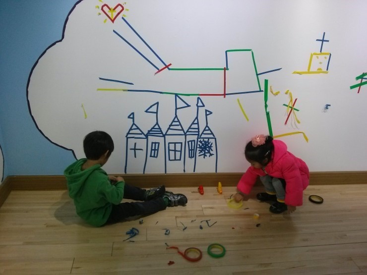 ![]() ![]() 4층 전시장에 들어가보니 종이 테이프로 여러 가지를 꾸밀 수 있도록 해 놓았다.