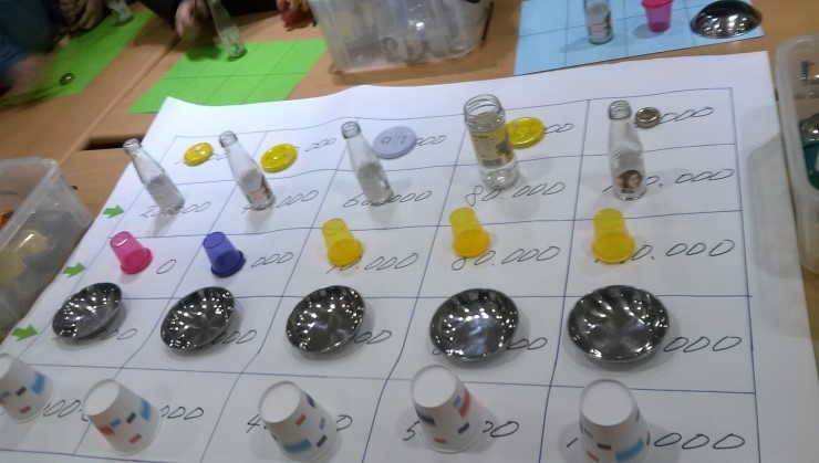 자, 이제 본게임으로 들어갑니다. 2인 1조로 모두 10조로팀을 이루어서,사장님이 되어서 직접 공장운영을 해봅니다. ![]() 플라스틱, 종이, 캔, 알루미늄, 유리등 제품이 나뉘어져 있는 주사위를 먼저 던집니다. 두번 같은 제품이 나오면 시장에 내다팔 수 있습니다. 그러면 그 금액에 해당하는 돈을 벌 수 있습니다. ![]() 두어번씩 해보니 이제 아이들 눈이 초롱초롱.... 광채가 나기 시작합니다.