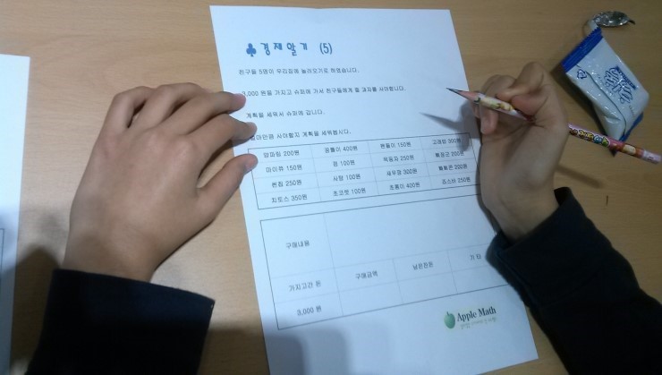 오늘 예산인 3천원으로 과자를 삽니다. 친구들이 좋아하는 초코렛, 과자등을 구매금액에 적습니다. 남은잔돈도어디에 쓸지 생각합니다.