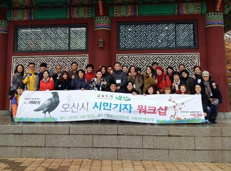 ▲ 오산시를 상징하는 꽃 매화(지조의 상징)와 시조인 까마귀(효의 상징)의 그림이 있는 플랜카드를 들고 환하게 웃고 있는 "오산시민기자"분들, 앞으로 많은 활약 기대하겠습니다.