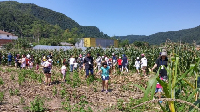 도착하자마자, 옥수수 따기에 도전합니다. 1인당 하나씩, 고학년들은 똑똑 잘도 땁니다만, 저학년들은 키가 모자라 부모님에게 도움을 청합니다. 이렇게 각자 딴 옥수수는 체험하는 동안 맛있게 삶아져 우리를 기다릴겁니다.
