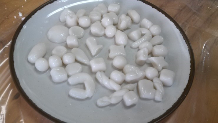 찹쌀가루는 익반죽을 합니다. 아이들 솜씨 보이시나요? 하트, 세모, 네모, 동그라미 모양으로 모두 제각각입니다.