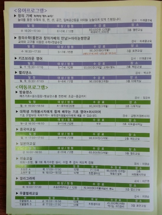 저희 아이들이 장기 애용중인 오산종합사회복지관~ 유아, 아동, 성인, 노인을 위한 다양한 프로그램들이 준비되어있거든요. ![]() 이번 월요일부터는 4월부터 시작하는 2학기 프로그램의 신규수강생 모집을 하고 있습니다. 접수기간: 3월 23일(월)부터 마감시까지 교육기간: 4월 3일(금)-6월 26일(금) ※ 프로그램별 수업일수에 따라 종강날짜가 상이할 수 있습니다. ※ 주 2회 수업은 학기당 24회, 주 1회 수업은 학기당 12회 기준입니다. 단, 국경일 및 공휴일은 휴강이며, 보강하지 않습니다. 5월 5일(화) 어린이날, 5월 25일(월) 석가탄신일은 휴관입니다.