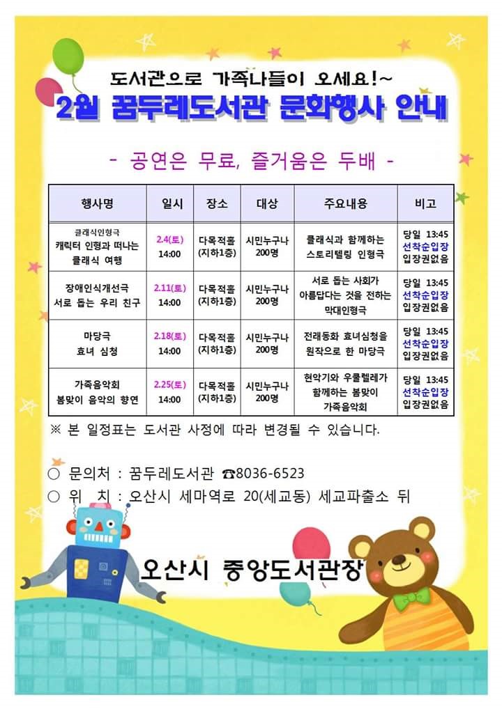 | 꿈두레도서관 마당극 <효녀 심청>;과 2월 오산도서관 문화 행사 안내<시민기자 김유경>; | |||||