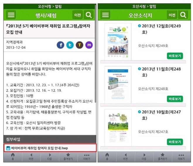 물론전통적이고익숙한이방법은 상당히 편리하지만, 이동 중에는 접근이 쉽지 않다는 단점이 있었습니다. 그러면 오산앱에선 오산시의 정보를 어떻게 담고 있는걸까요? 아래 이미지를 한 번 보도록 하겠습니다. 먼저, 오산앱을 실행하면 아래와 같은 메인 화면이 나타납니다. 알림, 민원 등 다양한 항목들이 있지만, 오산시민이라면 오산소식에 밝아야하는 것이 가장 중요하지 않을까요? 그래서 저는 오산앱의 알림 항목이 오산앱에서 가장 활용도가 높다고조심스럽게 말씀드리겠습니다 ^^ 위와 같이 알림페이지에 들어가보면, 총 7가지의항목이 있는데 웹 기반으로 앱이 만들어졌기 때문에 항목 하나를 클릭할때마다오산시청 웹페이지와 연동이 되는 것을 눈으로 확인해 볼 수 있습니다. 2.소프트웨어없이도 문서 조회가 가능하다 재밌는건, 일반 앱이나 시청 홈페이지에선 특정 소프트웨어(한글/엑셀/워드 등)가 설치되어 있지 않으면 확인이 불가능했던 것들이 오산앱에서는 기본으로 Viewer를 제공하기 때문에, 모바일 상으로도 바로 첨부파일 확인이 가능합니다. ![]() 이처럼 베이비부머***.hwp라는 파일을 누르게 되면 짜잔!!!! 아래와 같이 한글 파일을 읽을 수가 있습니다.