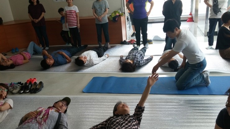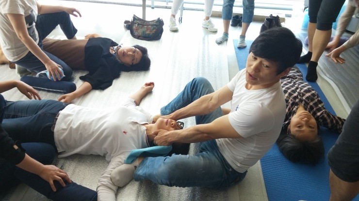 두명이 한팀이 되어 어깨를 풀어줍니다. 의외로 둥근어깨인분들이 많습니다. 양어깨를 바닥으로 지긋이 누르니 여기저기서 "아야, 아~~~~아아아"하며, 방언이 터집니다. 그만큼 우리가 머리와 어깨를 숙이는 자세에 익숙해져 둥근어깨가 되어버린것이죠. 의식적으로 어깨와 목을 뒤로 젖히며, 스트레칭 해주는 운동이 굉장히 중요하답니다.