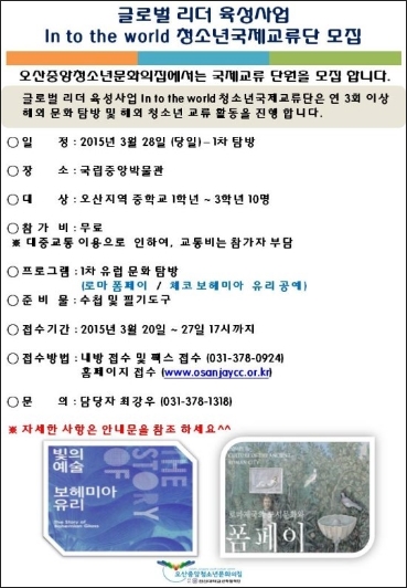 문화체험 활동 활성화를 위하여 글로벌 리더 육성사업을 운영하고 있다고 합니다. ![]() 2015년 3월 ~ 11월 / 연 3회 이상 실시하는 사업이며, 지금 첫 프로그램 참가자를 모집하고 있습니다.