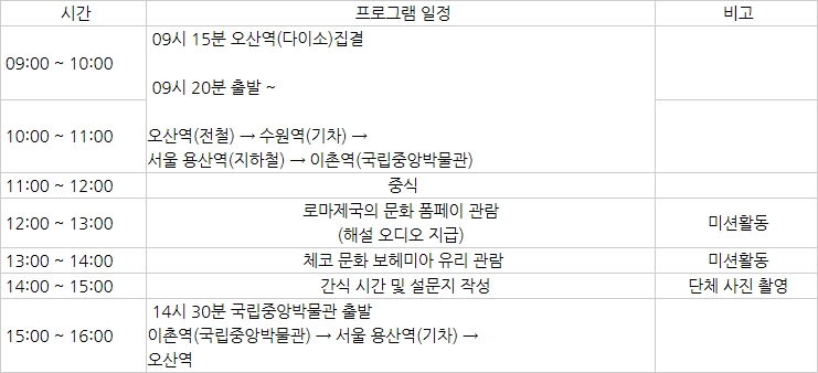 ▶ 출발 일시 및 장소 o 2015년 3월 28일(토) 오산역 (다이소 앞) o 9시 15분 까지 집결 o 2015년 3월 28일(일) 15시 오산역 (다이소 앞 해산) ※ 대중교통 사정에 따라 도착 시간이 다소 변경 될 수 있습니다. o 이동경로 출발 : 오산역(전철) → 수원역(기차) → 서울 용산역(지하철) → 이촌역(국립중앙박물관) 도착 : 이촌역(국립중앙박물관) → 서울 용산역(기차) → 오산역 ![]() 참가신청서 작성 후 내방접수 및 팩스접수(031-378-0924)를 하면 됩니다.