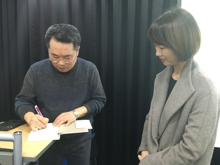 ▲ 열성팬이 들고 온 책에 사인을 해주는 모습