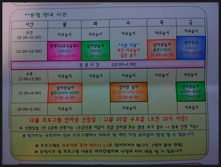 시간표를 보시면 아이들이 좋아하고 엄마들이 꼭 하고 싶었던 수업들이 많이 있다는것을 알수 있답니다. 그럼 어떻게 신청하면 될까요?? 프로그램은 인터넷 접수이며 다음카페에 오산아이러브맘카페 1호점을 검색한 후 카페를 방문하여 회원가입을 합니다. 가입승인을 받은 후에 수업 신청 당일에 글쓰기를 시작합니다. 신청당일 1인 2강좌 신청이 가능하며 수강인원 미달시 익일 인터넷 또는 방문으로 추가 접수가 가능하네요~! 중복 신청도 가능합니다.
