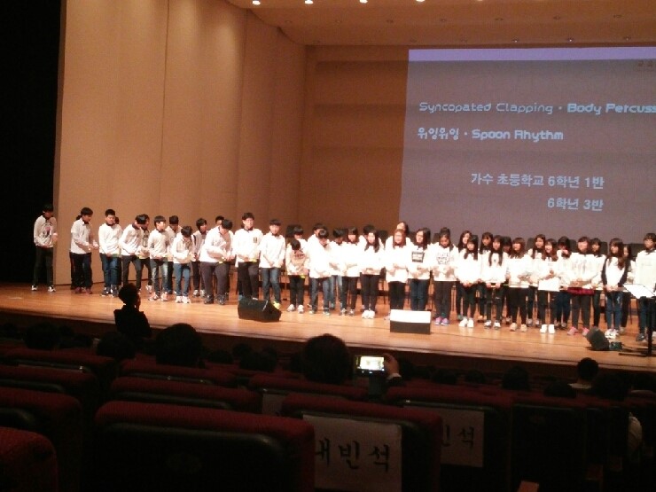 가수초 아이들이 손뼉과 발스텝으로 연주를 합니다. 저학년과는 다르게 곰살맞게 귀엽네요.ㅎㅎㅎ