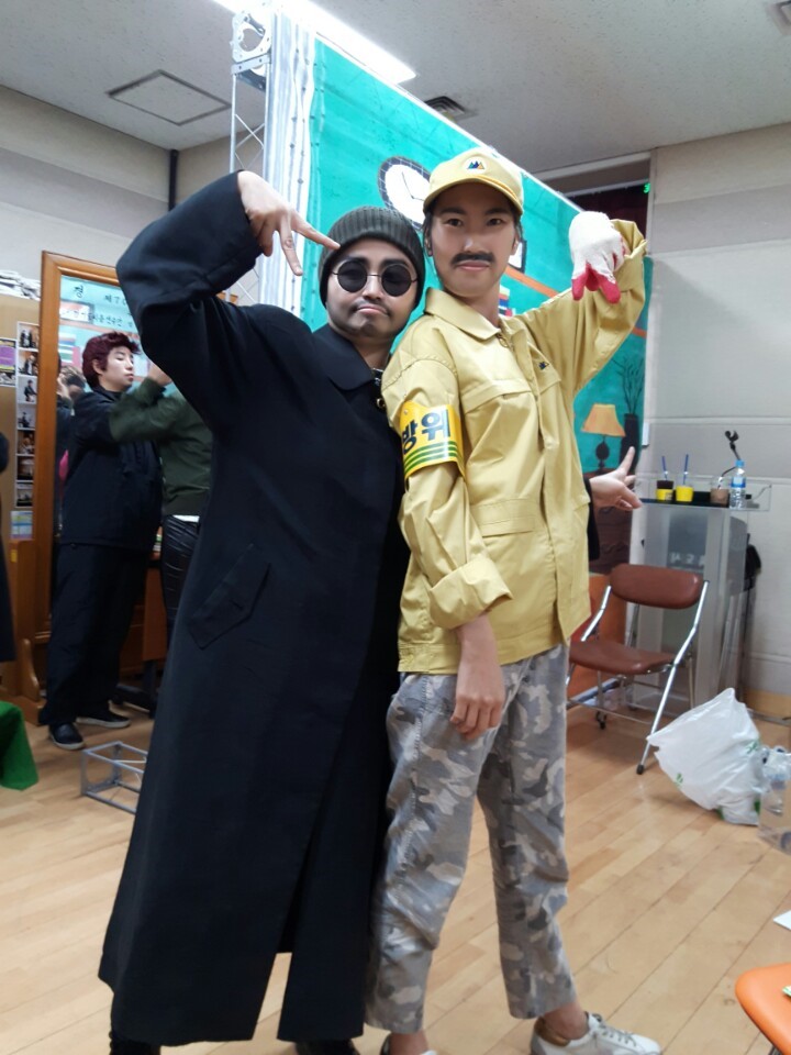 ▲ 무대 뒤 모습-북한 공작원과 민방위교육관 그저 서로의 격려가 고맙고 배려가 감사하고 스스로에게 대견해서 복잡한 감정이 밀려들었었죠. 오늘도 여전히 필봉초등학교 학부모들은 책 하나씩 옆구리에 끼고서 각반에 들어갔습니다. 무릎독서회 선생님을 맞이하는 각 반에서 떠들썩한 소리가 들리기 시작합니다.