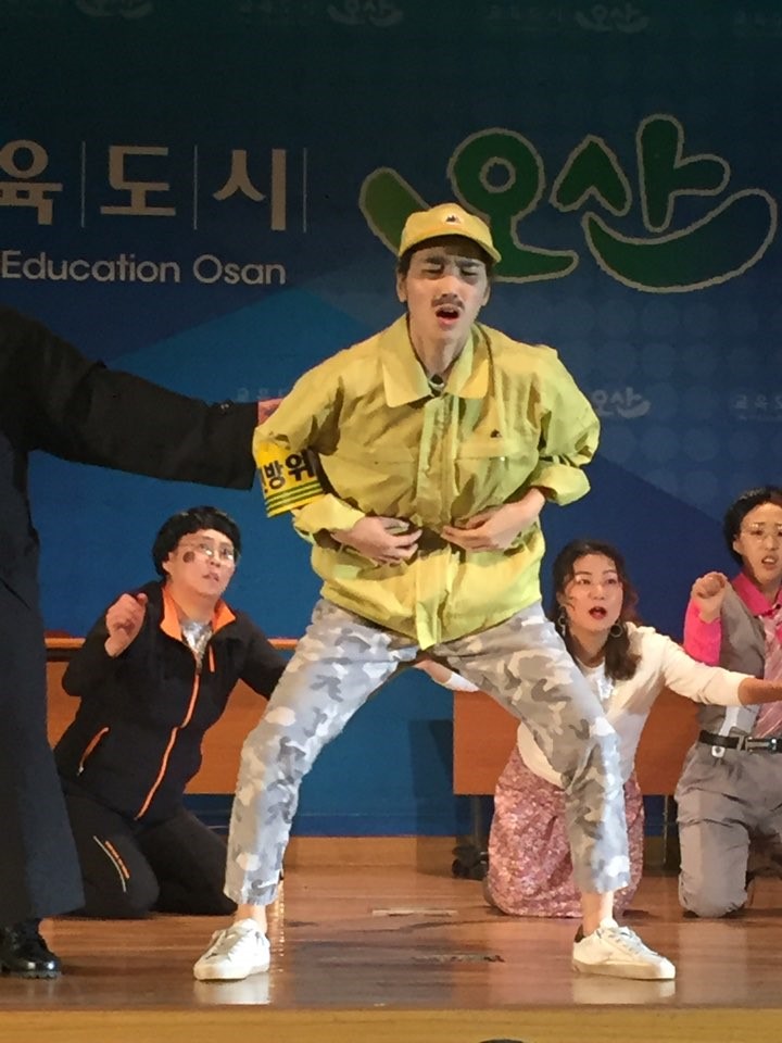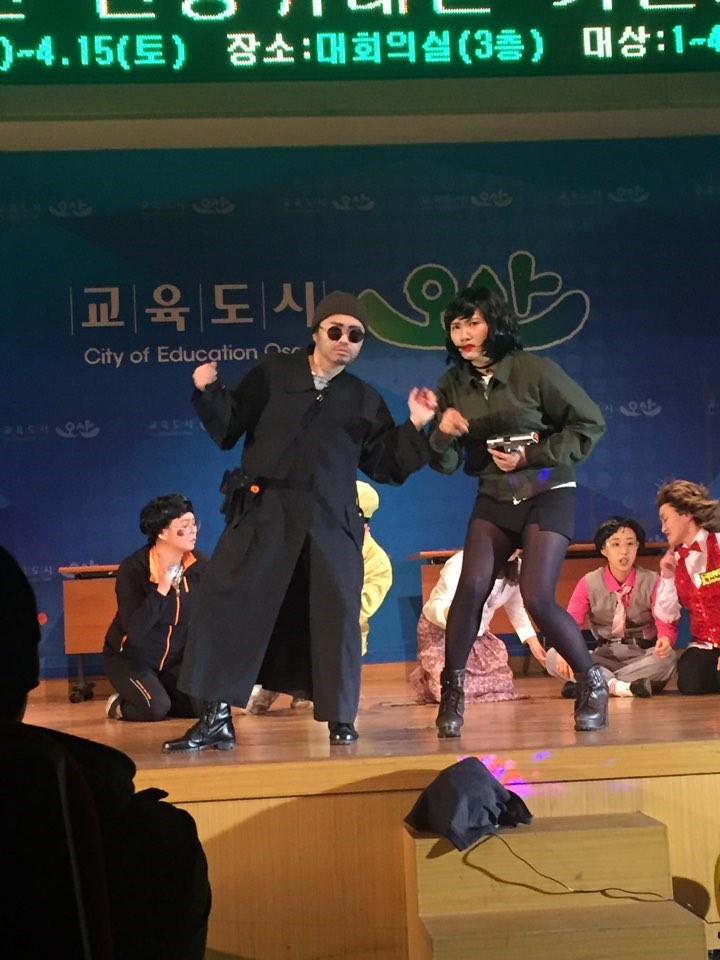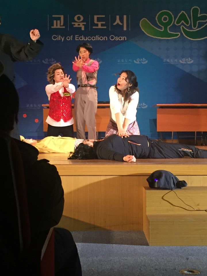 ▲ 민방위 교육생들에게 재난/안보 연기를 펼치고 있는 모습 12명의 어머니들로 구성된 [크로세티아-크로우:까마귀(오산 시조)+포세티아:개나리(필봉초등학교 교화)]라는 새로운 극단 이름과 “오늘을 산다” [오:산:] 이라는 단체 의미도 생겼으니 조금 부족하더라도 못할 것은 없었습니다. 일주일간의 연극이 끝나고 난 뒤 무대 뒤에서 연극팀 모두는 울고 웃으며 화려한 막을 내렸어요.