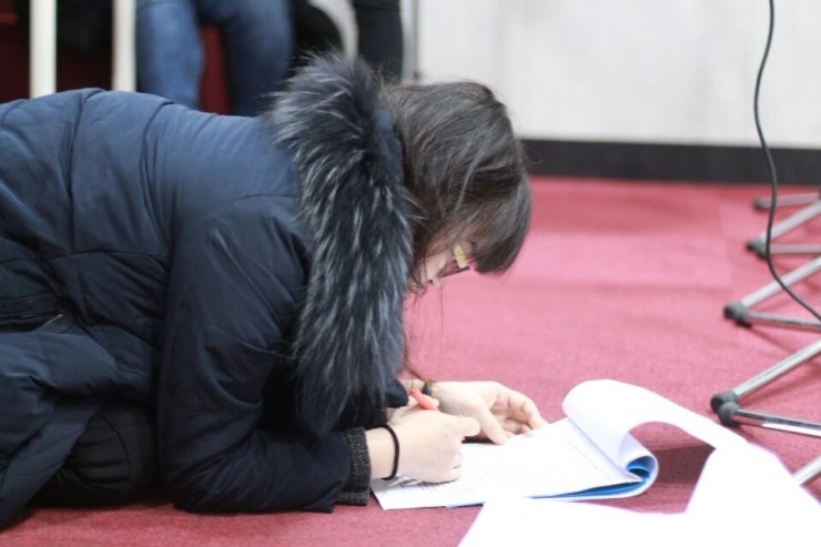 ▲ 틈틈히 연극 연습을 하고 있는 필봉초등학교 학부모들 500명 이상 되는 민방위 교육생들 앞에서 연극을 하기 전, 첫 무대의 떨림이 아직도 생각나네요. 심장은 요동치고 얼굴에는 긴장감이 역력한데 연기를 풀어내느라 진땀을 뺐었죠. 하지만 2회, 3회를 거듭할수록 자연스러운 표현이 가능했고, 더 많은 연기를 보일 수 있는 여유까지 생겨서 연극팀 서로에게 많은 격려와 힘이 되기도 했답니다.