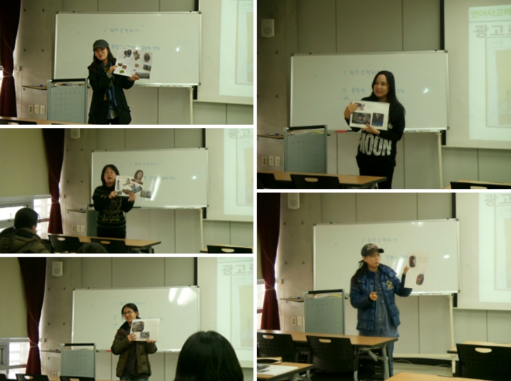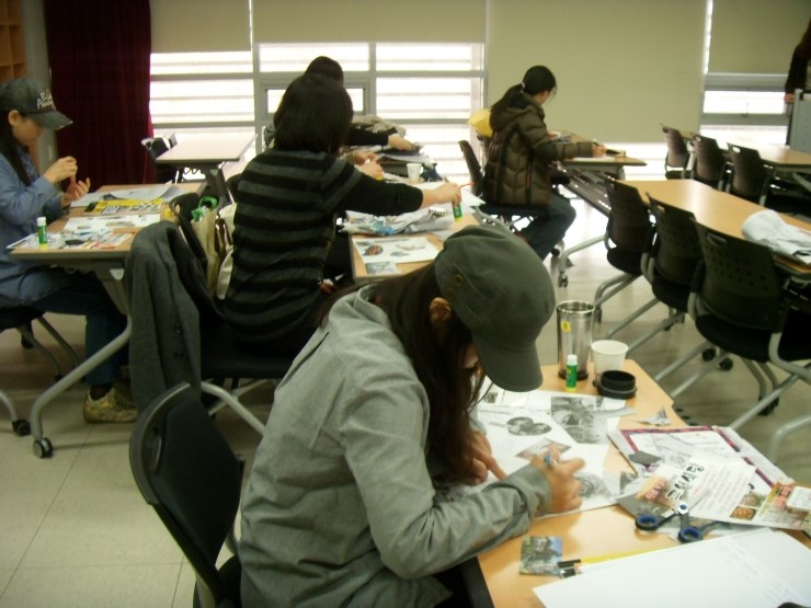 종강을 즈음하여 언어사고력 지도사 수업을 살짝 들여다 보았다. 내가 간 날은 신문과 잡지에서 오려낸 사진을 붙여서 자기 소개하기와 긍정적 감정과 부정적 감정을 표현하는 사진을 오려 붙이고 발표하는 수업을 진행하고 있었다.
