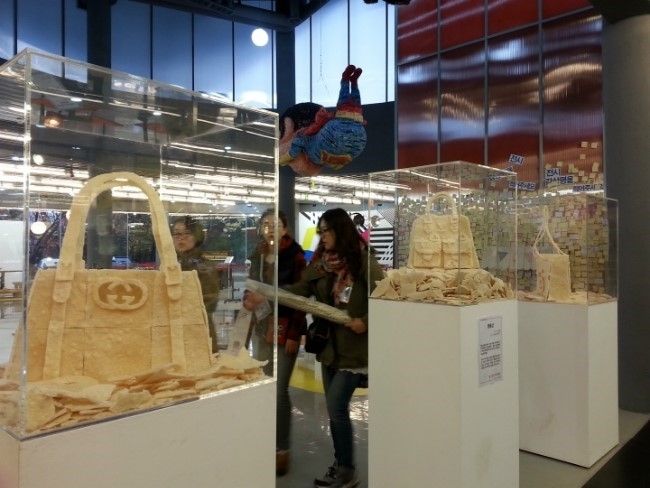 ▲ 이 작품의 이름은 "뻥품샵"인데요. "명품샵에서 볼 수 있는 샤넬, 루이비통 가방이 뻥튀기로 탄생했다. 과장 포장된 명품의 이미지를 뻥튀기라는 흔하고 저렴한 소재로 풍자했다. 작가는 먹다 남은 눅눅한 뻥튀기를 차곡차곡 박스에 모아두었다가 뻥품샵을 차렸다. 가짜라는 의미를 지닌 뻥이라는 어감을 살려 명품의 허상을 꼬집고 있다" 이 설명을 읽지 않아도 한 눈에 이해되는 작품이라 인상깊었습니다.
